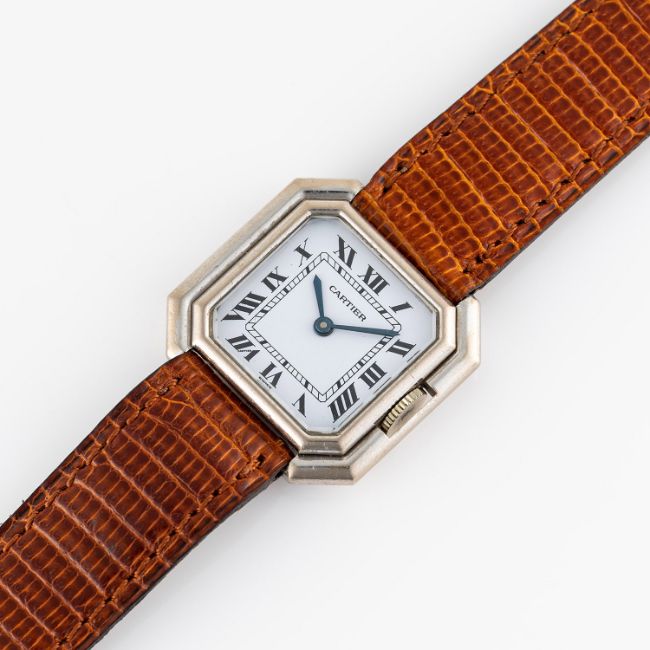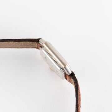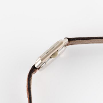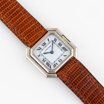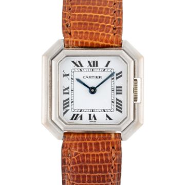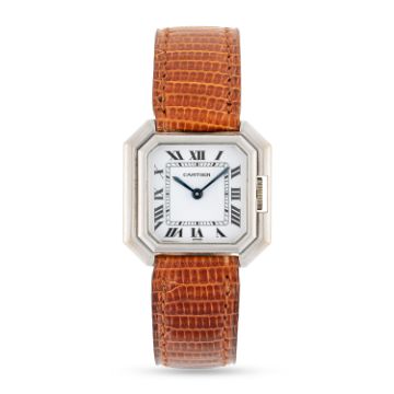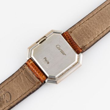 A RARE LADIES 18K SOLID WHITE GOLD CARTIER PARIS CEINTURE WRIST WATCHCIRCA 1980, REF. 78100 Movement: 17J, manual wind, signed Cartier.Case: Measures approx. 24.9mm, signed Cartier Paris, numbered, 18k hallmarks. Strap: Cartier leather strap & base metal Cartier pin buckle. CONDITION REPORTDial: Original dial in very good condition, some light crazing to the surface.Movement: Running & functioning at present, timekeeping and accuracy cannot be guaranteed.Case: In very good condition, with some small scratches due to general use.Strap/Bracelet: In good condition.