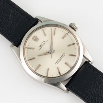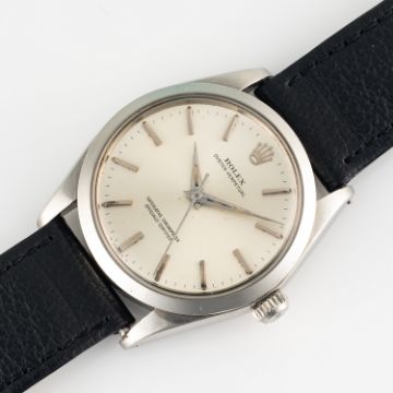 A GENTLEMAN'S SIZE STAINLESS STEEL ROLEX OYSTER PERPETUAL WRIST WATCHCIRCA 1968, REF. 1002 SILVER DIAL WITH DAUPHINE HANDS Movement: 26J, automatic chronometer, cal. 1560, signed Montres Rolex S.A, numbered.Case: Diameter approx. 34mm, Oyster case, signed Montres Rolex S.A., numbered 1,1xx,xxx, Rolex crown.Strap: Leather.  CONDITION REPORTDial: Original dial good condition, showing some small signs of age. Movement: Running & functioning at present, timekeeping and accuracy cannot be guaranteed. Case: In good condition, with some small scratches and wear due to general use. Strap/Bracelet: In excellent condition.