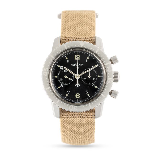 A VERY RARE GENTLEMAN'S SIZE STAINLESS STEEL SOUTH AFRICAN AIR FORCE LEMANIA PILOTS CHRONOGRAPH WRIST WATCH CIRCA 1970s, REF. 817 SAAFMovement: 17J, manual wind, cal. 1872, signed Lemania, numbered.Case: Diameter approx. 41mm, screw back, numbered, issue markings AF 10901, 60 minute rotating bezel, anti-slip crown. Strap: Fabric. CONDITION REPORTDial: Original dial in excellent condition.Movement: Running & functioning at present, timekeeping and accuracy cannot be guaranteed.Case: In very good condition, with small scratches due to use, nicely faded "Ghost" bezel.Strap/Bracelet: In excellent condition.