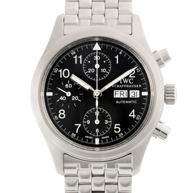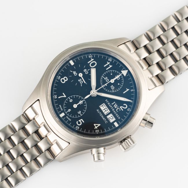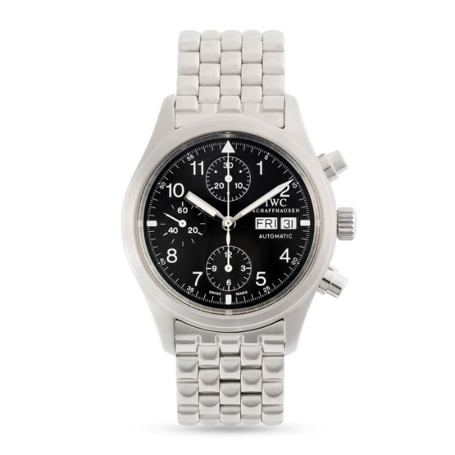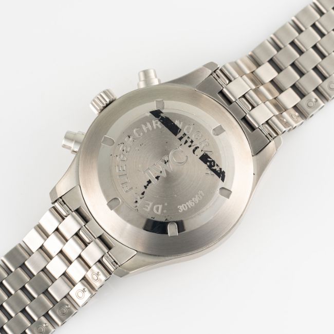 A GENTLEMAN'S SIZE STAINLESS STEEL IWC FLIEGER CHRONOGRAPH BRACELET WATCH DATED 2004, REF. IW370601 WITH ORIGINAL BOX, GUARANTEE CARD & BOOKLETSMovement: Automatic, signed International Watch Co.Case: Diameter approx. 39mm, screw back, signed Der Fliegerchronograph, numbered, IWC screw-down crown.Bracelet: Original IWC stainless steel bracelet. CONDITION REPORTDial: Original dial in excellent condition.Movement: Running & functioning at present, timekeeping and accuracy cannot be guaranteed.Case: In excellent condition, IWC service sticker applied to case back.Strap/Bracelet: In excellent condition, with some light scratches.