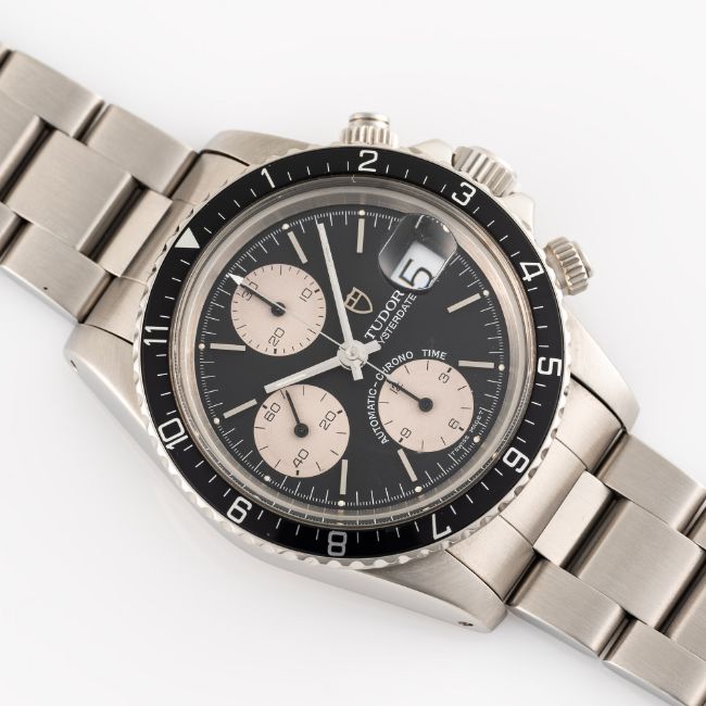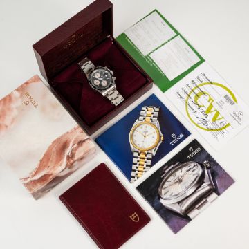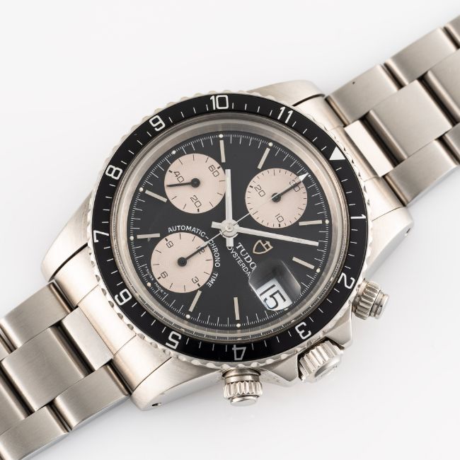 A GENTLEMAN'S SIZE STAINLESS STEEL ROLEX TUDOR OYSTERDATE AUTOMATIC CHRONO TIME "BIG BLOCK" CHRONOGRAPH BRACELET WATCHCIRCA 1994, REF. 79170 WITH "REVERSE PANDA" DIAL, ACCOMPANIED BY TUDOR BOX & BOOKLETS Movement: 17J, automatic, cal. 7750, signed Tudor Automatic-Prince.Case: Diameter approx. 40mm, Oyster case, case back ref 9420, signed Montres Tudor S.A., numbered B5xx,xxx, 12 hour by-rotational bezel, Rolex triplock crown & screw-down pushers.Bracelet: Rolex Oyster bracelet, numbered 78360/589.  CONDITION REPORTDial: Original dial in excellent condition. Movement: Running & functioning at present, timekeeping and accuracy cannot be guaranteed. Case: In very good condition, with some light scratches due to general use. Strap/Bracelet: In very good condition.