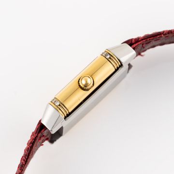 A LADY'S STAINLESS STEEL & GOLD JAEGER LECOULTRE REVERSO FLORALE WRIST WATCHCIRCA 2005, REF. 265.5.08Movement: Quartz, signed Jaeger-LeCoultre.Case: Measures approx. 33mm by 21mm, reversible case with factory set diamonds, signed Jaeger-LeCoultre, numbered 2,4xx.xxx, original crown. Strap: Leather. CONDITION REPORTDial: Original dial in excellent condition.Movement: Running & functioning at present, timekeeping and accuracy cannot be guaranteed.Case: In very good condition, with some scratches due to general use.Strap/Bracelet: In good condition.