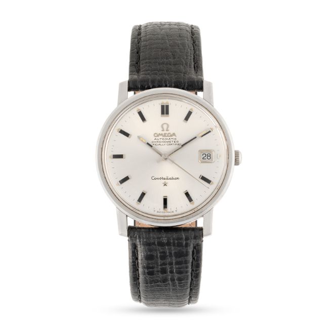 A GENTLEMAN'S SIZE STAINLESS STEEL OMEGA CONSTELLATION AUTOMATIC CHRONOMETER DATE WRIST WATCH CIRCA 1970, REF. 168.018 WITH VOLKSWAGEN CAR MANUFACTURES LOGO ON THE CASE BACKMovement: 24J, automatic chronometer, cal. 564, signed Omega Watch Co., numbered 26,8xx,xxx.Case: Diameter approx. 35mm, screw back, Constellation badge embossed on case back with VW logo and 1970 date, signed Omega Watch Co, Omega crown, Omega plexiglass.Strap: Leather. CONDITION REPORTDial: Original dial in good condition, showing some signs of ageMovement: Running & functioning at present, timekeeping and accuracy cannot be guaranteed.Case: In very good condition, with some scratches due to general use.Strap/Bracelet: In excellent condition.