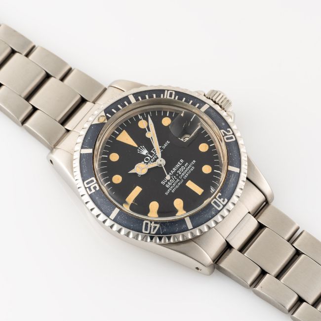 A GENTLEMAN'S SIZE STAINLESS STEEL ROLEX OYSTER PERPETUAL DATE SUBMARINER BRACELET WATCHCIRCA 1979, REF. 1680 WITH MK1 WHITE WRITING DIAL Movement: 26J, automatic chronometer, cal. 1570, signed Montres Rolex S.A., numbered.Case: Diameter approx. 40mm, Oyster case, signed Montres Rolex S.A., numbered 5,8xx,xxx, 60 minute rotating bezel, Rolex triplock crown.Bracelet: Rolex Oyster Submariner bracelet, numbered S R6/93150/580.  CONDITION REPORTDial: Original dial in excellent condition. Movement: Running & functioning at present, timekeeping and accuracy cannot be guaranteed. Case: In very good condition, with some scratches and wear due to general use. Strap/Bracelet: In good  condition, showing some movement between the lugs.
