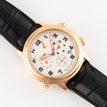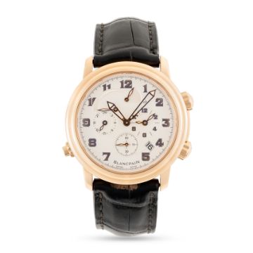A GENTLEMAN'S SIZE 18K ROSE GOLD BLANCPAIN LEMAN REVEIL GMT WRIST WATCH CIRCA 2010, REF. 2041-362M-53BMovement: 38J, automatic, alarm function, cal. 12416, signed Blancpain, numbered.Case: Diameter approx. 40mm, exhibition back, signed, numbered, 18k hallmarks, original crowns.Strap: Original Blancpain leather strap & rose gold deployment clasp.  CONDITION REPORTDial: Original dial in excellent condition.Movement: Running & functioning at present, timekeeping and accuracy cannot be guaranteed.Case: In excellent condition, with some small scratches due to general use.Strap/Bracelet: Strap in good condition, deployment is excellent.