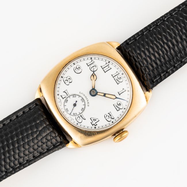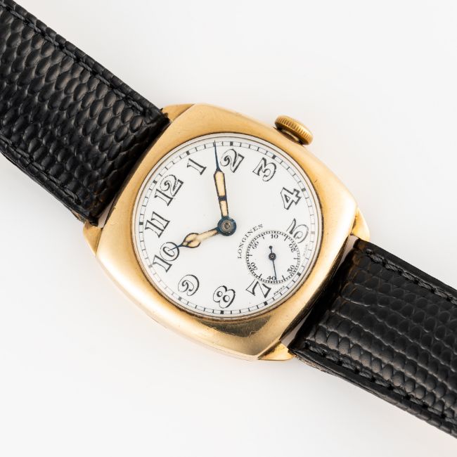 A GENTLEMAN'S SIZE 9CT SOLID GOLD LONGINES WRIST WATCH CIRCA 1930s, WITH WHITE ENAMEL DIAL Movement: 15J, manual wind, cal.12.92 signed Longines Watch Co, numbered 5,2xx,xxx.Case: Width approx. 31mm, cushion case with snap back, Dennison case made in England, 9k hallmarks, numbered. Strap: Leather strap. CONDITION REPORTDial: Original dial in excellent condition.Movement: Running & functioning at present, timekeeping and accuracy cannot be guaranteed.Case: In very good condition, with some scratches due to general use.Strap/Bracelet: In excellent condition.