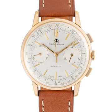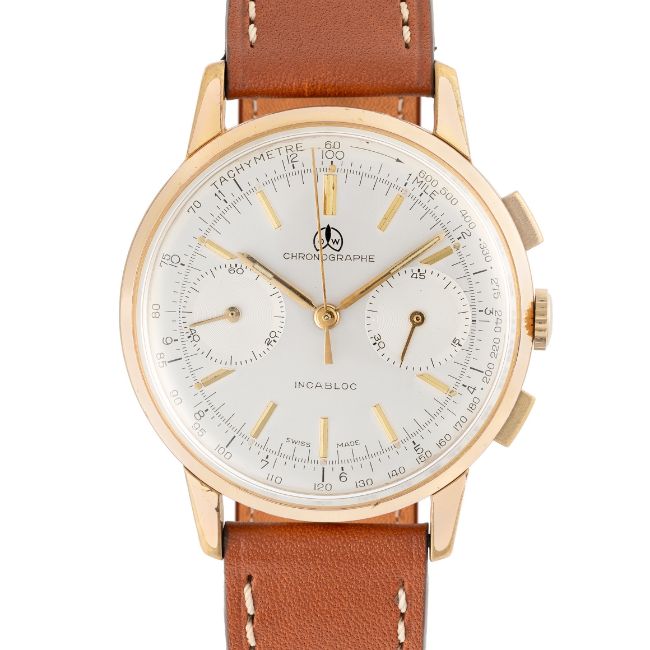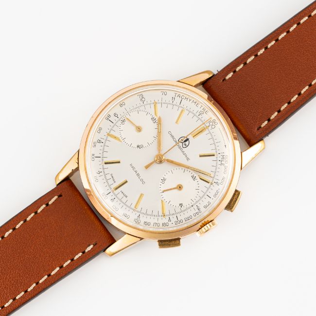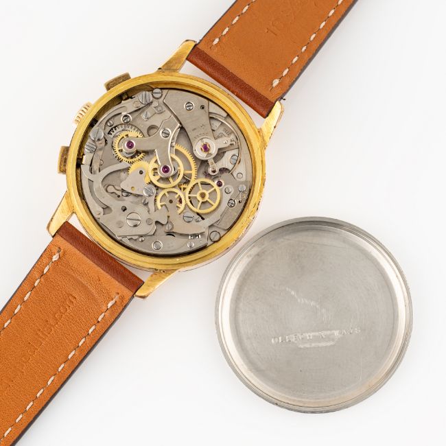 A GENTLEMAN'S SIZE GOLD PLATED OLLECH & WAJS CHRONOGRAPH WRIST WATCH CIRCA 1960sMovement: 17J, manual wind, Valjoux cal. 7730.Case: Diameter approx. 36mm, steel snap back, signed Ollech & Wajs.Strap: Leather. CONDITION REPORTDial: Original dial in very good condition, showing some small signs of age.Movement: Running & functioning at present, timekeeping and accuracy cannot be guaranteed.Case: In good condition, with some scratches and wear due to general use.Strap/Bracelet: In excellent condition.