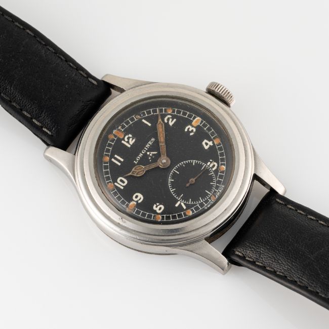 A GENTLEMAN'S STAINLESS STEEL BRITISH MILITARY LONGINES W.W.W. WRIST WATCH CIRCA 1945, PART OF THE "DIRTY DOZEN"Movement: 15J, manual wind, cal. 12.68Z, signed Longines, numbered 6,9xx,xxx.Case: Diameter approx. 37.5mm, fixed bars, screw back, issue markings 23088 4875 ^ WWW F8599, lug numbered 1292.Strap: Leather.  CONDITION REPORTDial: Original dial in fair condition, showing signs of age. Movement: Running & functioning at present, timekeeping and accuracy cannot be guaranteed. Case: In very good condition, with some small scratches & light wear due to use. Strap/Bracelet: In fair condition.