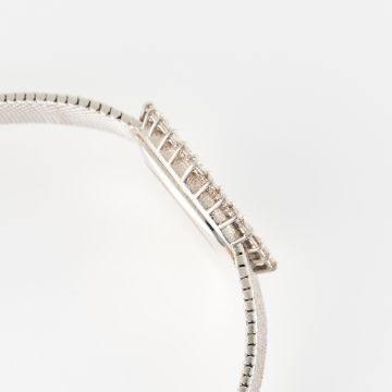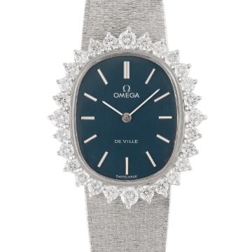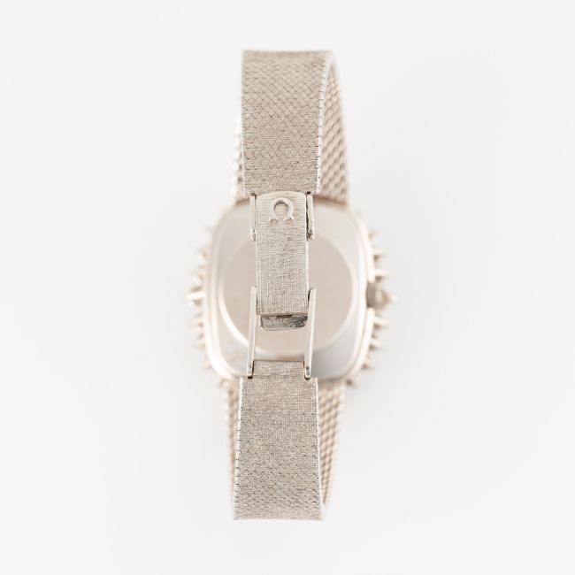 A LADY'S FINE 18K SOLID WHITE GOLD & DIAMOND OMEGA GENEVE BRACELET WATCHCIRCA 1972, REF. 8283Movement: Manual wind, cal. 625, signed Omega Swiss, numbered 35,xxx,xxx.Case: Approx. 31.8mm by 28mm, factory diamond set bezel, signed Omega Watch Co, numbered, 18k hallmarks, original Omega crown. Bracelet: Original Omega 18k solid gold integral bracelet numbered 711.1914, size approx. 15cm. CONDITION REPORTDial: Original dial in excellent condition.Movement: Running & functioning at present, timekeeping and accuracy cannot be guaranteed.Case: In excellent condition, with some light scratches due to general use.Strap/Bracelet: In very good condition, with some surface scratches.