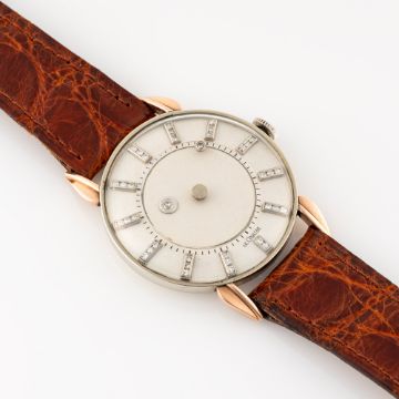 A GENTLEMAN'S SIZE 14K WHITE & ROSE GOLD LECOULTRE VACHERON CONSTANTIN GALAXY MYSTERY WRIST WATCHCIRCA 1950s, WITH FACTORY SET DIAMOND DIALMovement 17J, manual wind, cal. 480/CW, signed LeCoultre, numbered.Case: Diameter approx. 33mm, snap back case, signed LeCoultre & Vacheron Constantin, gold mark 14K, numbered, LeCoultre crown.Strap: Leather.  CONDITION REPORTDial: Dial in very good condition. Movement: Running & functioning at present, timekeeping and accuracy cannot be guaranteed. Case: In very good condition, with some light scratches due to general use. Strap/Bracelet: In good condition.