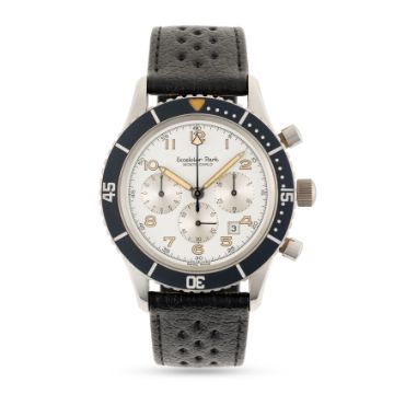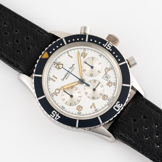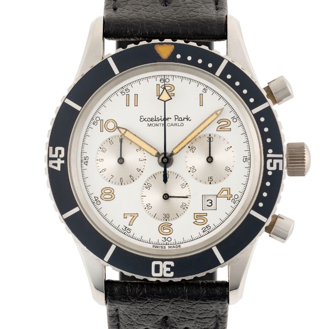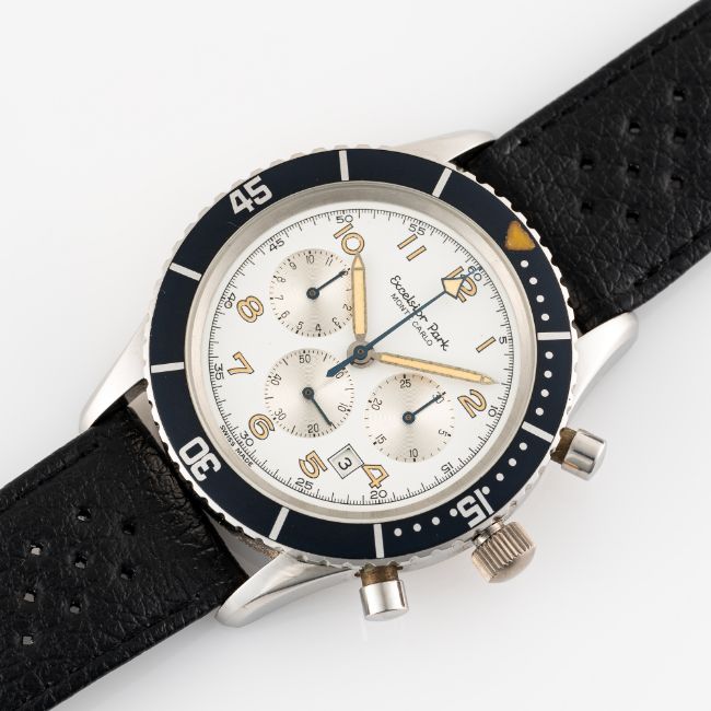 A GENTLEMAN'S SIZE STAINLESS STEEL EXCELSIOR PARK MONTE CARLO CHRONOGRAPH WRIST WATCH CIRCA 1980s, REF. 7740 WITH WHITE DIALMovement: 17J, manual wind, Valjoux cal. 7740.Case: Diameter approx. 43mm, screw back, signed signed Excelsior Park, rotating 60 minute bezel.Strap: Perforated leather strap. CONDITION REPORTDial: Original dial in excellent condition.Movement: Running & functioning at present, timekeeping and accuracy cannot be guaranteed.Case: In excellent condition, with some light scratches due to general use.Strap/Bracelet: In excellent condition.