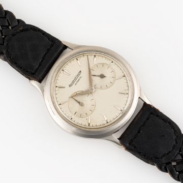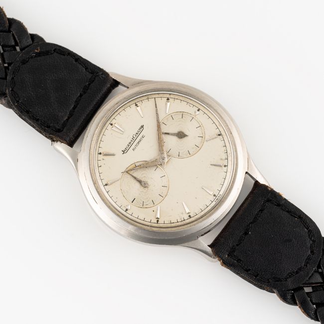 A RARE GENTLEMAN'S SIZE STAINLESS STEEL JAEGER LECOULTRE FUTUREMATIC AUTOMATIC ALARM WRIST WATCHCIRCA 1950s, REF. E501Movement: "Bumper" automatic, cal. 497, signed Jaeger-LeCoultre.Case: Diameter approx. 37mm, two-part case back, signed LeCoultre Co, numbered, original crown.Strap: Leather. CONDITION REPORTDial: Original dial in good condition, showing some signs of ageMovement: Running & functioning at present, timekeeping and accuracy cannot be guaranteed.Case: In very good condition, with some light scratches and wear due to general use.Strap/Bracelet: In good condition.