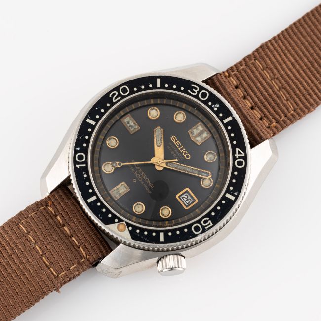 A RARE GENTLEMAN'S SIZE STAINLESS STEEL SEIKO PROFESSIONAL 300M "GRAIL" HI-BEAT AUTOMATIC DIVERS WRIST WATCHCIRCA 1969, REF. 6159-7001 Movement: Hi-Beat automatic, quick-set date, signed Seiko. Case: Diameter approx. 44mm, "monocoque" case, signed Seiko, numbered, 60 minute rotating bezel, screw-down crown.Strap: Textile. CONDITION REPORTDial: Original dial in good condition, showing some signs of age.Movement: Running & functioning at present, timekeeping and accuracy cannot be guaranteed.Case: In good condition, with some scratches due to general use.Strap/Bracelet: In excellent condition.
