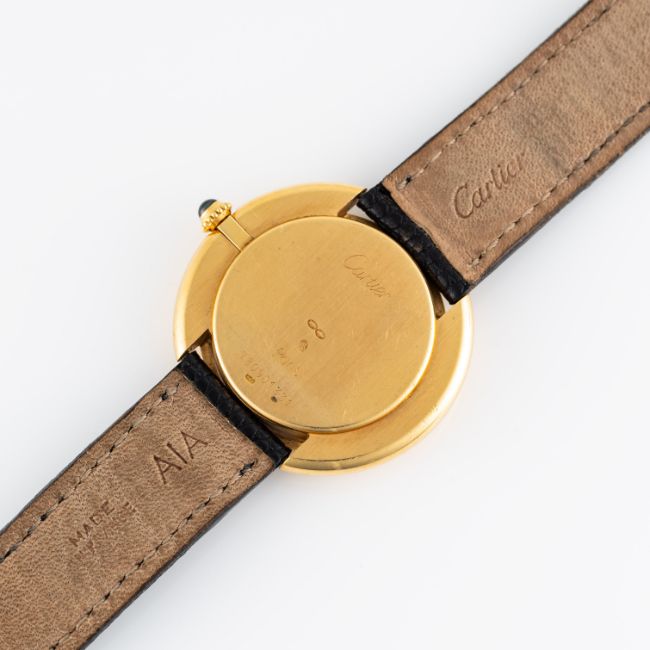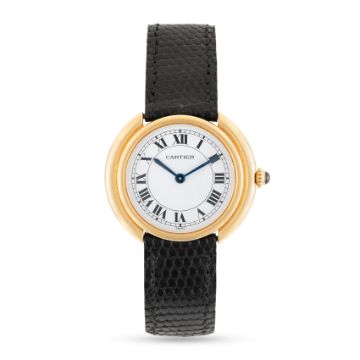 A GENTLEMAN'S SIZE 18K SOLID GOLD CARTIER VENDOME WRIST WATCHCIRCA 1980, REF. 78090Movement: 17J, manual wind, signed Cartier.Case: Measures approx. 33mm by 28.6mm, signed Cartier Paris, numbered, 18k hallmarks, sapphire crown. Strap: Carter leather strap with original 18k solid gold Cartier deployment clasp. CONDITION REPORTDial: Cartier dial signed Swiss, in excellent condition.Movement: Running & functioning at present, timekeeping and accuracy cannot be guaranteed.Case: In very good condition, with light scratches due to general use, small scratches to the crystal.Strap/Bracelet: In very good condition.