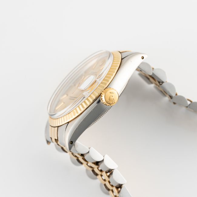 A GENTLEMAN'S SIZE STEEL & GOLD ROLEX OYSTER PERPETUAL DATE BRACELET WATCHCIRCA 1972, REF. 1500/3 WITH CHAMPAGNE DIALMovement: 26J, automatic chronometer, cal. 1570, signed Montres Rolex S.A., numbered.Case: Diameter approx. 36mm, Oyster case, signed Montres Rolex S.A., dated I.72, serial no. 2,9xx,xxx, solid gold fluted bezel, Rolex crown.Bracelet: Rolex steel & gold Jubilee bracelet, numbered N11/62523H.18/455. CONDITION REPORTDial: Rolex service/refinished dial in good condition, showing some signs of age.Movement: Running & functioning at present, timekeeping and accuracy cannot be guaranteed.Case: In very good condition, with small scratches due to general use.Strap/Bracelet: In very good condition, with light scratches & wear.