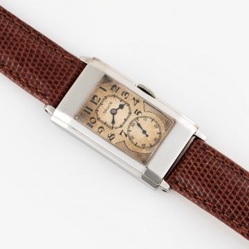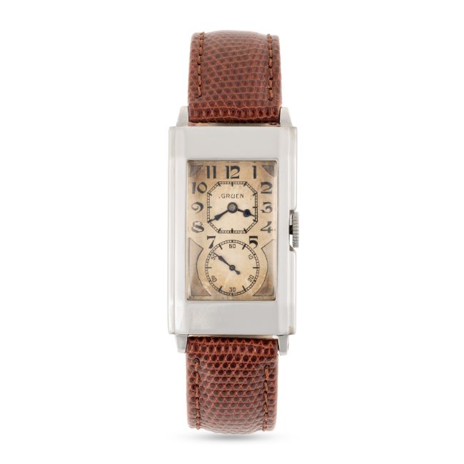 A GENTLEMAN'S SIZE GRUEN PRINCE DUO DIAL WRIST WATCHCIRCA 1930s Movement: 15J, manual wind, signed Gruen Guild A, numbered.Case: Measures approx. 34mm (excluding lugs) by 21.3mm, snap back, signed Gruen Guildite, base metal, numbered. Strap: Leather. CONDITION REPORTDial: Original dial in good condition, showing signs of age.Movement: Running & functioning at present, timekeeping and accuracy cannot be guaranteed.Case: In very good condition, with some scratches and wear due to general use.Strap/Bracelet: In very good condition.