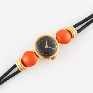 A LADY'S 18K SOLID GOLD UNIVERSAL GENEVE COCKTAIL WATCH CIRCA 1937, RETAILED BY ASPREY Movement: Manual wind, cal. 244, signed Universal Geneve.Case: Circular case with stone set lugs, length approx. 42mm including lugs, diameter approx. 15.5mm, signed Universal Geneve, 18k London import hallmarks letter B, numbered.Strap: Textile strap with 9ct gold buckle, measures approx. 15.25cm CONDITION REPORTDial: Original dial in good condition, showing signs of age.Movement: Running & functioning at present, timekeeping and accuracy cannot be guaranteed.Case: In good condition, with some small scratches due to general use, stones have been fitted back onto the lugs at some stage.Strap/Bracelet: In good condition.