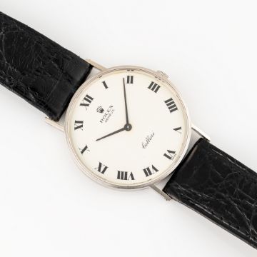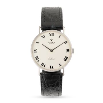A GENTLEMAN'S SIZE 18K WHITE GOLD ROLEX CELLINI WRIST WATCHCIRCA 1969, REF. 3833 WITH WHITE ROMAN NUMERAL DIALMovement: 19J, manual wind, cal. 1600, signed Rolex Geneva.Case: Diameter approx. 31mm, signed Montres Rolex S.A., 18k hallmarks, serial no. 2,1x,xxx, Rolex crown.Strap: Leather. CONDITION REPORTDial: Original dial in very good condition, showing some small signs of age.Movement: Running & functioning at present, timekeeping and accuracy cannot be guaranteed.Case: In very good condition, with light scratches due to general use.Strap/Bracelet: In good condition.