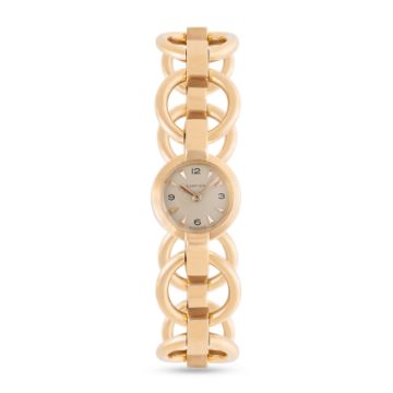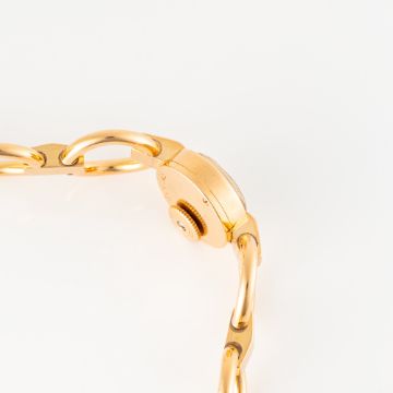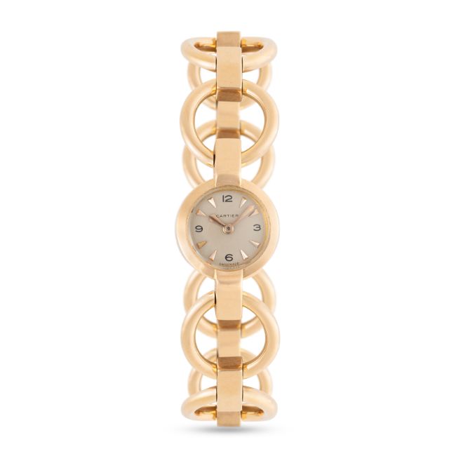 A LADY'S 18K SOLID PINK GOLD CARTIER BACK WIND BRACELET WATCHCIRCA 1950sMovement: 17J, manual wind, signed Cartier.Case: Diameter approx. 16.4mm, marked EJ, French 18k hallmarks, numbered, original crown. Bracelet: Original 18k pink gold bracelet, size approx. 15.75cm CONDITION REPORTDial: Refinished dial in excellent condition.Movement: Running & functioning at present, timekeeping and accuracy cannot be guaranteed.Case: In very good condition, with some light scratches due to general use.Strap/Bracelet: In very good condition.