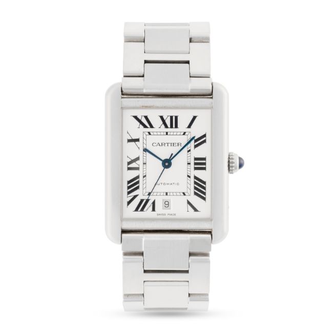 A GENTLEMAN'S SIZE STAINLESS STEEL CARTIER TANK SOLO AUTOMATIC BRACELET WATCHDATED 2017, REF. 3800 WITH ORIGINAL BOX & PAPERWORK Movement: Automatic, signed Cartier.Case: Measures approx. 40.7mm by 31mm, signed Cartier, numbered, sapphire crown. Bracelet: Original Cartier Solo stainless steel bracelet.  CONDITION REPORTDial: Original dial in excellent condition. Movement: Running & functioning at present, timekeeping and accuracy cannot be guaranteed. Case: In very good condition, with some scratches due to general use. Strap/Bracelet: In very good condition, with light scratches.