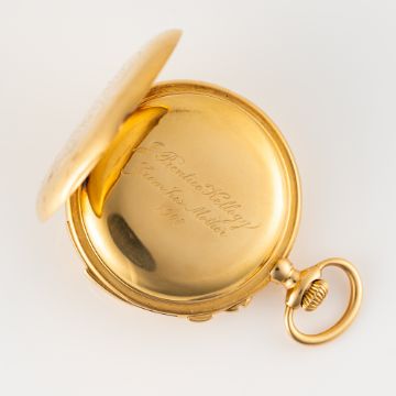 A FINE & RARE GENTLEMAN'S SIZE 18K SOLID GOLD OPEN FACE PATEK PHILIPPE FIVE MINUTE REPEATER SPLIT SECONDS CHRONOGRAPH POCKET MADE FOR TIFFANY & CO, NEW YORKDATED 1897, WITH ENAMEL DIAL, ACCOMPANIED BY PATEK PHILIPPE ARCHIVE EXTRACT Movement: Swiss keyless wind with lever escapement, 5 minute repeater activated by a sliding mechanism on the side of the case, chronograph stop and start through the winding crown and the split button just below that between 10 & 11 o'clock, signed Tiffany & Co, New York, numbered.Case: Diameter approx. 46mm, hinged case back & cuvette, case back initials, inscription on cuvette, case signed Tiffany & Co, 18k, matching case back and movement numbers. This watch was originally gifted to J. Prentice Kellogg from his Mother in 1900. John Prentice Kellogg was born in 1878 and graduated from Princetown University. In 1902 he joined the firm Strong Sturgess & Co. New York, and became a member of Schmit & Gallatin Bankers. He later went on to become Govenor of The New York Stock Exchange and Head of Marine Section Home Defence Military During WW1. CONDITION REPORTDial: Original dial in very good condition, two hairline cracks between 3 and 4 o'clock.Movement: Running & functioning at present, timekeeping and accuracy cannot be guaranteed.Case: In very good condition, with some scratches and wear due to general use.