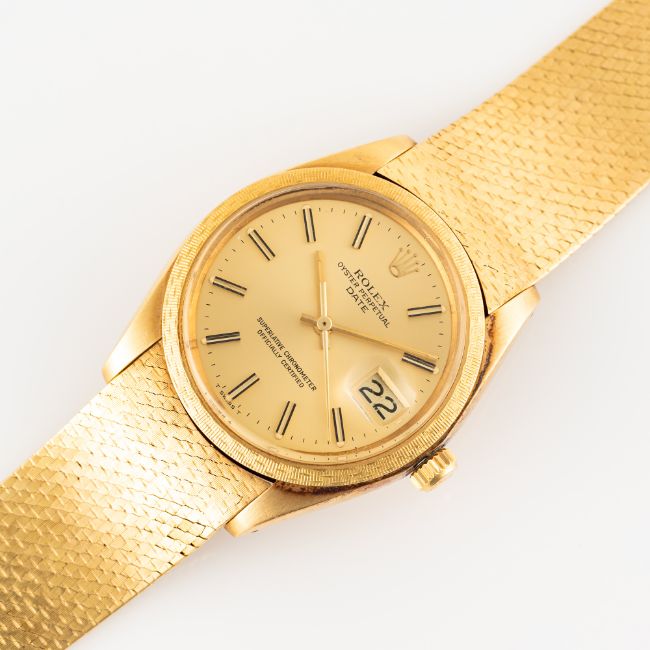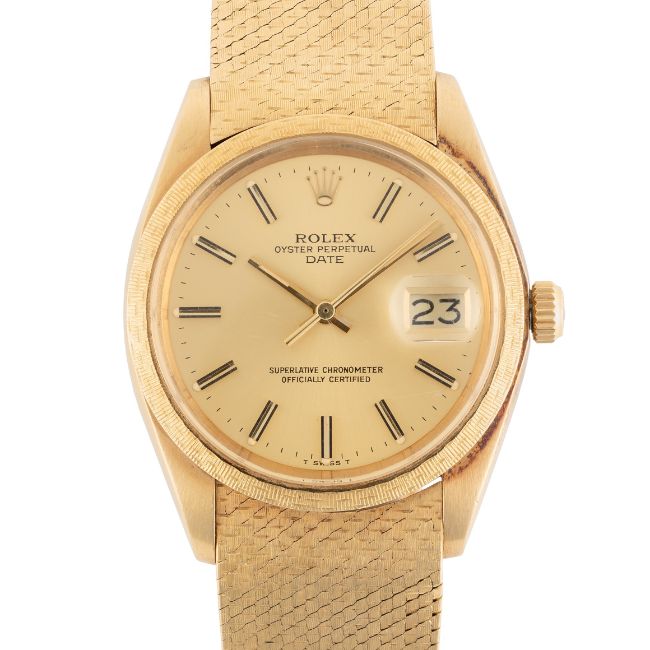 A RARE GENTLEMAN'S SIZE 18K SOLID GOLD ROLEX OYSTER PERPETUAL DATE BRACELET WATCHDATED 1978, REF. 1514 WITH ORIGINAL BOX, PAPERWORK, BOOKLETS & TAGMovement: 26J, automatic chronometer, cal. 1570, signed Montres Rolex S.A.,numbered.Case: Diameter approx. 34mm, Oyster case, signed Montres Rolex S.A., 18k hallmarks, serial no. 5,6xx,xxx, original Moiré bezel, Rolex crown.Bracelet: Original 18k solid gold Rolex bracelet. CONDITION REPORTDial: Original dial in excellent condition.Movement: Running & functioning at present, timekeeping and accuracy cannot be guaranteed.Case: In very good condition, with some light scratches due to general use.Strap/Bracelet: In very good condition with some light surface scratches.