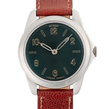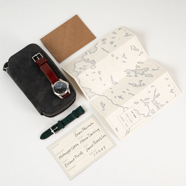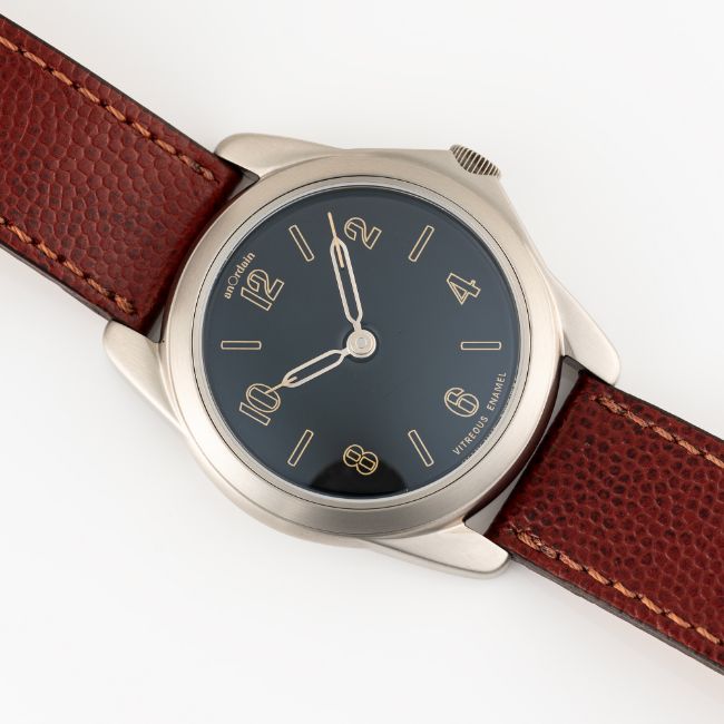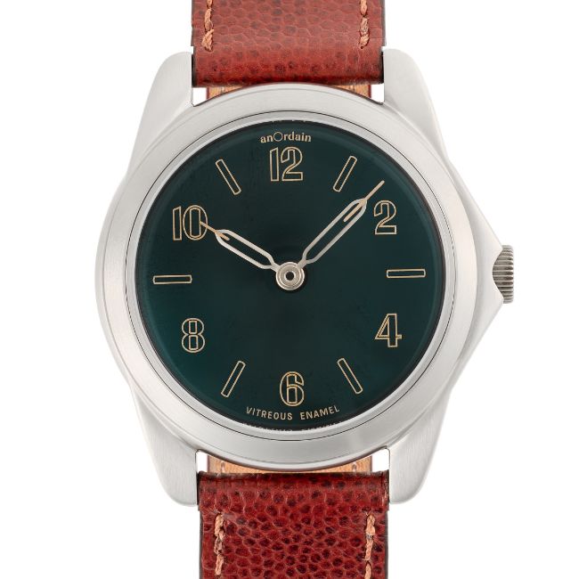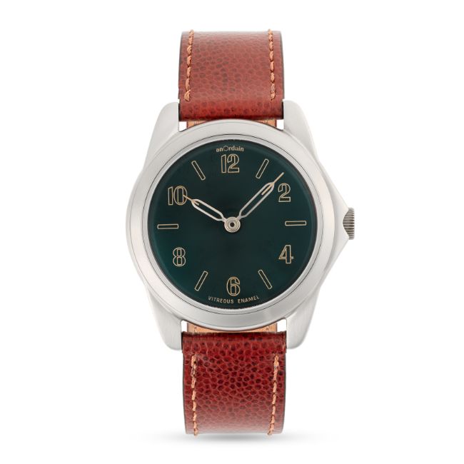 A GENTLEMAN'S SIZE STAINLESS STEEL ANORDAIN MODEL TWO WRIST WATCH CIRCA 2022, WITH MIDNIGHT GREEN VITREOUS ENAMEL DIAL, ACCOMPANIED BY ITS ORIGINAL BOX, PAPERWORK & ADDITIONAL SUEDE STRAPMovement: Manual wind. Case: Diameter approx. 36mm, screw back, signed, numbered, original crown.Strap: Anordain leather strap & pin buckle.  CONDITION REPORTDial: Original dial in excellent condition. Movement: Running & functioning at present, timekeeping and accuracy cannot be guaranteed. Case: In excellent condition. Strap/Bracelet: In very good condition.