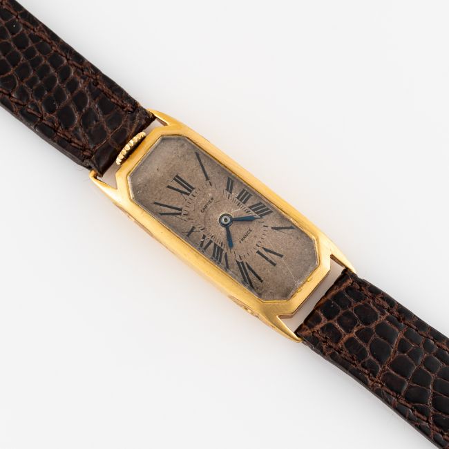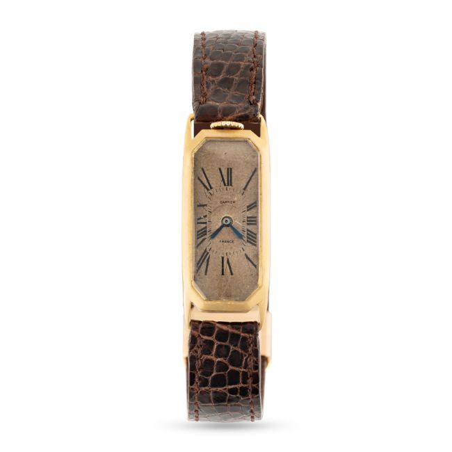 Movement: 19J, manual wind, signed Cartier Paris, 8 adjustments, number under the dial matches one set on the case back.