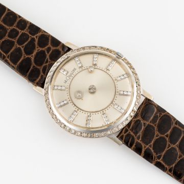 A GENTLEMAN'S SIZE 14K WHITE GOLD & DIAMOND SET LECOULTRE GALAXY MYSTERY WRIST WATCHCIRCA 1960, WITH FACTORY SET DIAMOND BEZEL & DIALMovement 17J, manual wind, cal. 818/2, signed LeCoultre, numbered.Case: Diameter approx. 33.4mm, snap back case, signed LeCoultre, gold mark 14K, numbered.Strap: Leather. CONDITION REPORTDial: Original dial in excellent condition.Movement: Running & functioning at present, timekeeping and accuracy cannot be guaranteed.Case: In excellent condition, with some light scratches due to general use.Strap/Bracelet: In excellent condition.