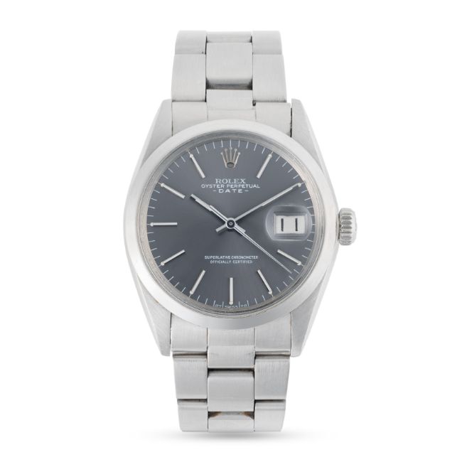 A GENTLEMAN'S SIZE STAINLESS STEEL ROLEX OYSTER PERPETUAL DATE WRIST WATCHCIRCA 1972, REF. 1500 WITH SUNBURST GREY SIGMA DIALMovement: 26J, automatic chronometer, cal. 1570, signed Montres Rolex S.A., numbered.Case: Diameter approx. 34mm, Oyster case, signed Montres Rolex S.A., case back dated III.72, serial no. 3,1xx,xxx, Rolex crown.Bracelet: Rolex Oyster bracelet numbered L1/78350/557. CONDITION REPORTDial: Original dial in excellent condition.Movement: Running & functioning at present, timekeeping and accuracy cannot be guaranteed.Case: In very good condition, with some scratches due to general use.Strap/Bracelet: In very good condition with surface scratches.
