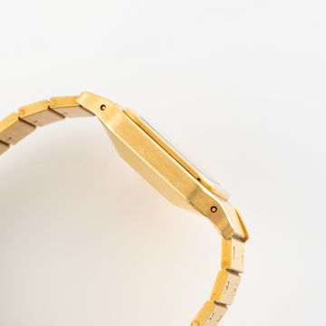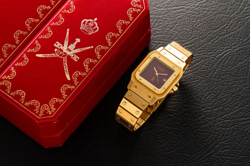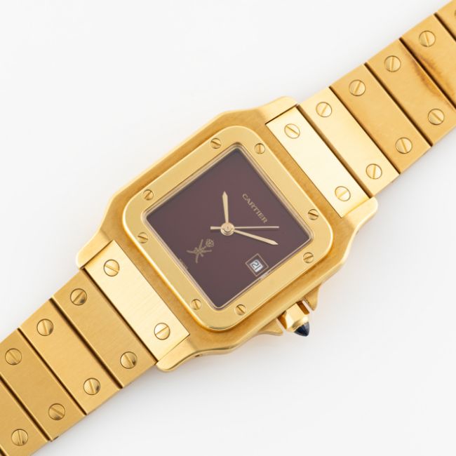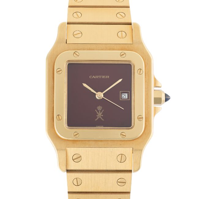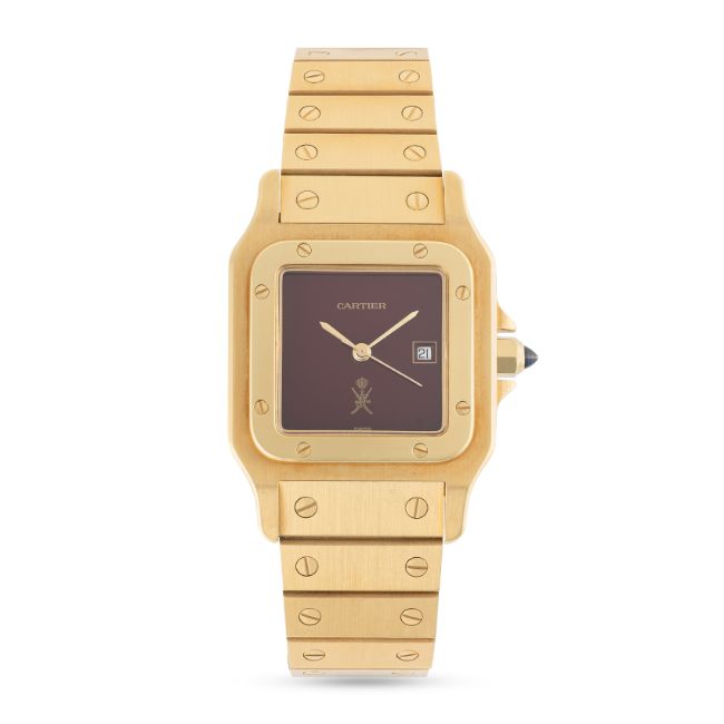 AN EXTREMELY RARE GENTLEMAN'S SIZE 18K SOLID GOLD CARTIER SANTOS CARREE AUTOMATIC BRACELET WATCHCIRCA 1986, SPECIAL ORDER WITH BURGUNDY DIAL AND ROYAL OMANI KHANJAR CREST, COMMISSIONED AND PRESENTED BY HH SULTAN QABOOS BIN SAID OF OMAN TO THE ORIGINAL OWNER (WHILST WAS SERVING AS DEFENCE ATTACHE IN MUSCAT), THE WATCH WAS WORN ON THE OCCASION OF A ROYAL VISIT BY HH PRINCE AND PRINCESS OF WALES TO OMAN IN 1986, THE WATCH IS ACCOMPANIED BY THE ORIGINAL CARTIER BOX WITH ROYAL OMANI KHANJAR CREST EMBOSSED, CONSIGNED BY THE FAMILY OF THE ORIGINAL OWNER Movement: Automatic, signed Cartier.Case: Width approx. 29mm, signed Santos de Cartier, numbered, sapphire crown. Bracelet: Original Cartier Santos 18k solid gold bracelet.  CONDITION REPORTDial: Original dial in excellent condition. Movement: Running & functioning at present, timekeeping and accuracy cannot be guaranteed. Case: In excellent condition, with some light scratches due to occsional use. Strap/Bracelet: In excellent condition with light scratches, clasp in fair condition and is slightly bent.