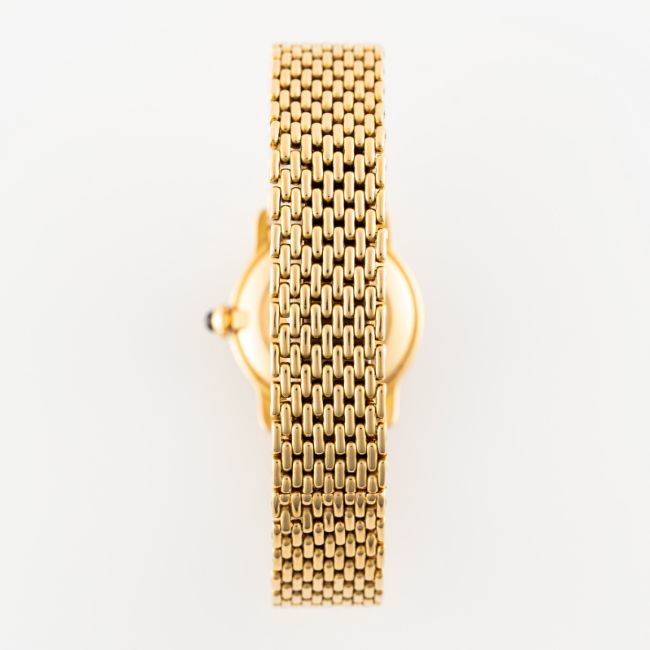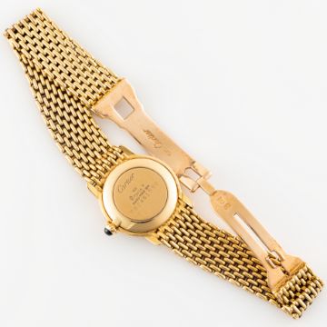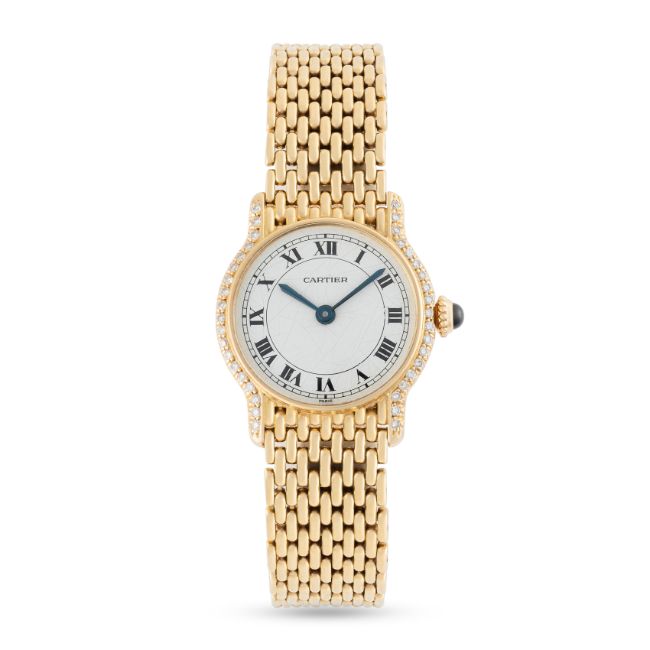 A LADY'S 18K SOLID GOLD & DIAMOND CARTIER RIVIERA BRACELET WATCHCIRCA 1980, REF. 78248 WITH CARTIER SERVICE PAPERWORK FROM 2017 (PHOTOCOPY) Movement: Manual wind, signed Cartier. Case: Diameter approx. 23.5mm, factory set diamond case, signed Cartier, 18k hallmarks, numbered, sapphire crown. Bracelet: Original Cartier 18k solid gold bracelet, size approx. 165mm. CONDITION REPORTDial: Original Paris dial in fair condition, showing some signs of age/crazing.Movement: Running & functioning at present, timekeeping and accuracy cannot be guaranteed.Case: In very good condition, with some light scratches due to general use.Strap/Bracelet: In very good condition.