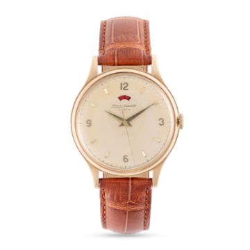 A RARE GENTLEMAN'S LARGE SIZE 18K SOLID ROSE GOLD JAEGER LECOULTRE AUTOMATIC POWER RESERVE WRIST WATCH CIRCA 1950s Movement: "Bumper" automatic, cal. 481, signed Jaeger LeCoultre, numbered.Case: Diameter approx. 36.5mm, screw back, marked L^C, 18k hallmarks, numbered.Strap: Leather. CONDITION REPORTDial: Original dial in very good condition, with an even patina.Movement: Running & functioning at present, timekeeping and accuracy cannot be guaranteed.Case: In very good condition, with some light scratches and wear due to general use.Strap/Bracelet: In good condition.