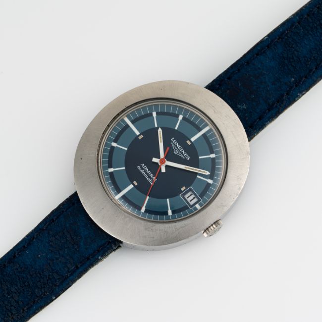 A GENTLEMAN'S SIZE STAINLESS STEEL LONGINES ADMIRAL AUTOMATIC WRIST WATCHCIRCA 1969 Movement: Automatic, signed Longines.Case: Measures approx. 39.5mm by 44mm, signed Longines, numbered, Longines crown.Strap: Leather. CONDITION REPORTDial: Original dial in excellent condition, hair on the dial near 6 o'clock.Movement: Running & functioning at present, timekeeping and accuracy cannot be guaranteed.Case: In good condition, with scratches due to general use.Strap/Bracelet: In fair condition.