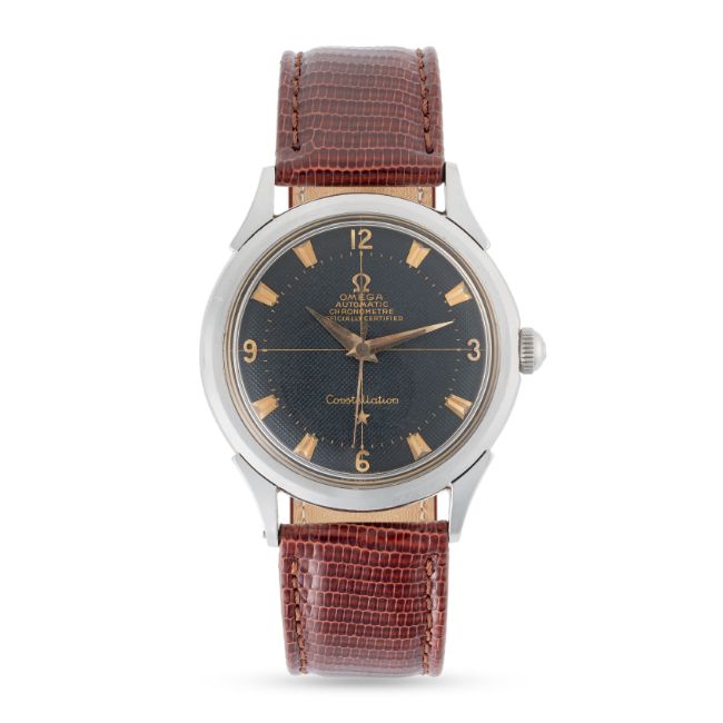 A RARE GENTLEMAN'S SIZE STAINLESS STEEL OMEGA CONSTELLATION WRIST WATCH CIRCA 1950, REF. 2652-1 WITH BLACK "HONEYCOMB" DIALMovement: 17J, "bumper" automatic Chronometer, cal. 352, signed Omega Watch Co., numbered 12,7xx,xxx.Case: Diameter approx. 35mm, screw back case, signed Omega Watch Co, Omega crown.Strap: Leather. CONDITION REPORTDial: Original dial in excellent condition.Movement: Running & functioning at present, timekeeping and accuracy cannot be guaranteed.Case: In very good condition, with some light scratches & wear due to general use.Strap/Bracelet: In fair condition.