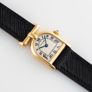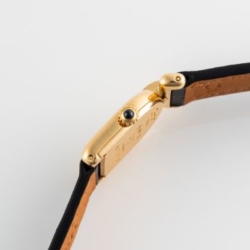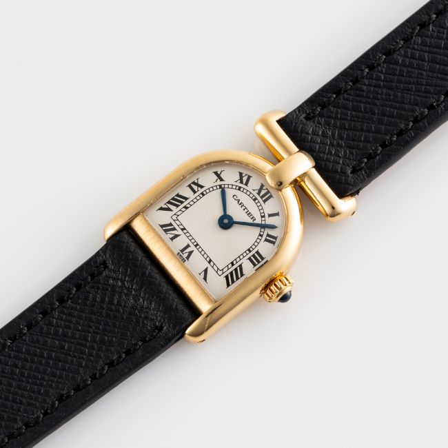 A LADY'S 18K SOLID GOLD CARTIER CLOCHE CALANDRE WRIST WATCH CIRCA 1990, REF. 6603 Movement: Quartz.Case: Measures approx. 26mm (including the lugs) by 18mm, two piece case, signed Cartier Paris, 18k hallmarks, numbered. Strap: Black leather with gold plated Cartier pin buckle.  CONDITION REPORTDial: Original dial in excellent condition. Movement: Running & functioning at present, timekeeping and accuracy cannot be guaranteed. Case: In excellent condition. Strap/Bracelet: In excellent condition.