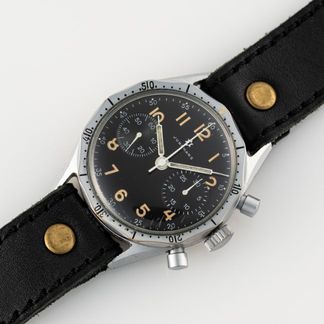 A GENTLEMAN'S GERMAN MILITARY JUNGHANS J88 PILOTS CHRONOGRAPH WRIST WATCH CIRCA 1960s, TYPE 111 WITH GLOSS BLACK DIAL, MADE IN GERMANY, WITH SERVICE RECIPT FROM SIMON FREESE WATCHMAKERS 2017. Movement: Manual wind, signed Junghans 88, numbered.Case: Diameter approx. 38mm, nickel plated case top & bezel with steel screw back, issue markings Bundeseigentum 12-124-8591.Strap: Leather.  CONDITION REPORTDial: Original dial in excellent condition, showing some small signs of age. Movement: Running & functioning at present, timekeeping and accuracy cannot be guaranteed. Case: In excellent condition, with some small scratches due to use. Strap/Bracelet: In very good condition. Independent service paperwork from 2017.