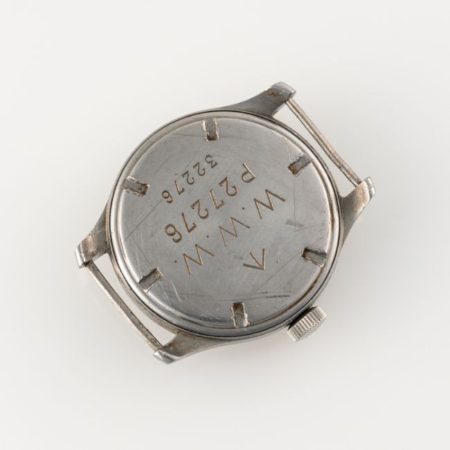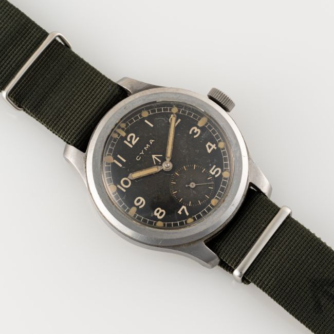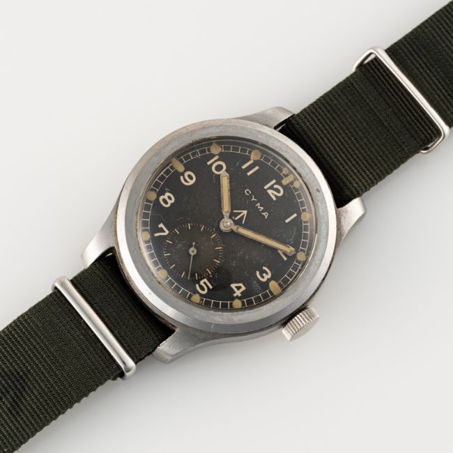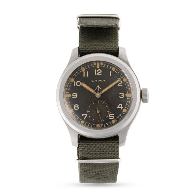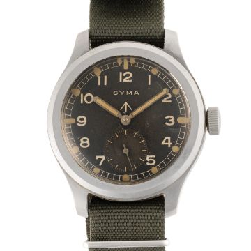 A GENTLEMAN'S STAINLESS STEEL BRITISH MILITARY CYMA W.W.W. WRIST WATCH CIRCA 1945, PART OF THE "DIRTY DOZEN"Movement: 15J, manual wind, cal. 234, signed Cyma, numbered.Case: Diameter approx. 38mm, fixed bars, screw back, issue markings ^ W.W.W. P27276 32276, dust cover.Strap: NATO.  CONDITION REPORTDial: Original dial in very good condition, showing some signs of age & patina. Movement: Running & functioning at present, timekeeping and accuracy cannot be guaranteed. Case: In very good condition, with some scratches due to use. Strap/Bracelet: In good condition.