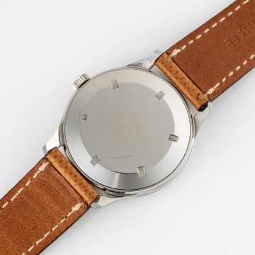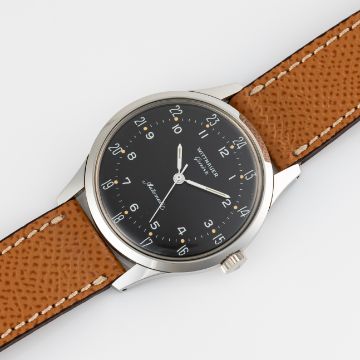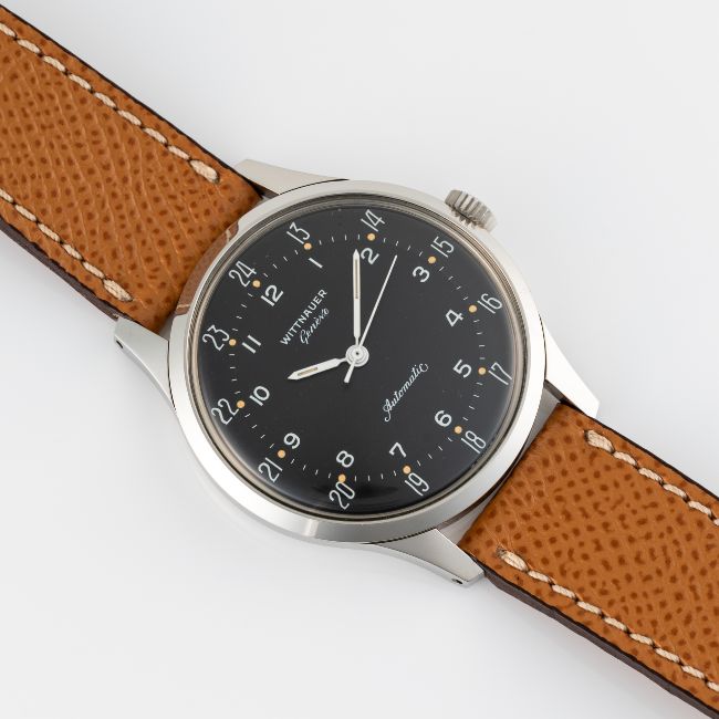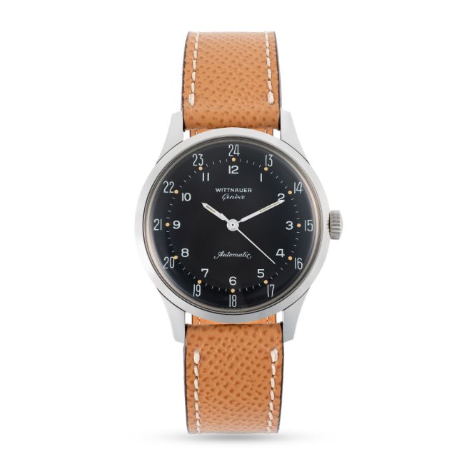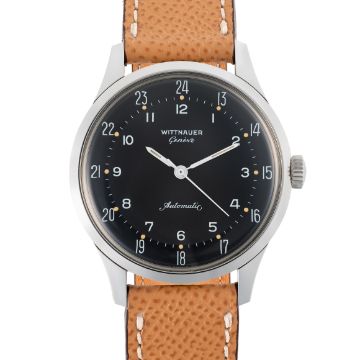 A RARE GENTLEMAN'S SIZE STAINLESS STEEL WITTNAUER GENEVE AUTOMATIC WRIST WATCH CIRCA 1960s REF. 8025, WITH TWO TONE BLACK 24 HOUR DIALMovement: 17J, automatic, cal. 11 KAS, signed Wittnauer Watch Co. Inc.Case: Diameter approx. 36mm, screw back case, signed Wittnauer Watch Co. Inc, Wittnauer crown.  Strap: Brown leather. CONDITION REPORTDial: Original dial in excellent condition.Movement: Running & functioning at present, timekeeping and accuracy cannot be guaranteed.Case: In very good condition, with some light scratches due to general use.Strap/Bracelet: In good condition.