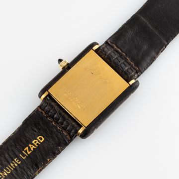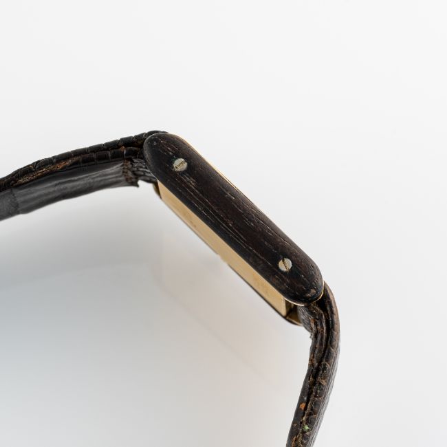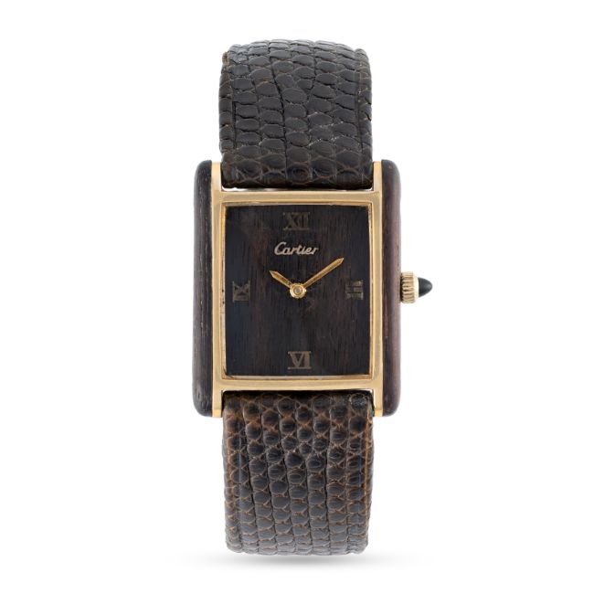 A RARE GENTLEMAN'S SIZE GOLD PLATED & BRAZILIAN ROSEWOOD CARTIER TANK WRIST WATCHCIRCA 1975, "PALISSANDRE DE RIO" Movement: Manual wind.Case: Approx. 24.5mm by 30mm, signed Cartier, original Cartier crown. Strap: Leather strap with gold plated Cartier pin buckle.  CONDITION REPORTDial: Original dial in excellent condition. Movement: Running & functioning at present, timekeeping and accuracy cannot be guaranteed. Case: In very good condition, with some light scratches due to general use. Strap/Bracelet: In good condition.