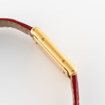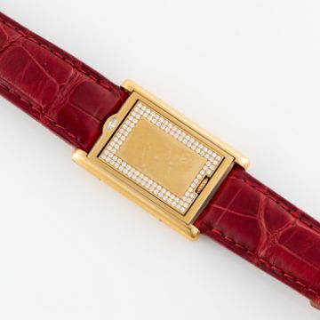 A RARE GENTLEMAN'S MID SIZE 18K SOLID GOLD & DIAMOND CARTIER TANK BASCULANTE WRIST WATCHCIRCA 2000s, REF. 2506  Movement: Quartz, signed Cartier. Case: Approx. 35.5mm by 24mm, Reverso style case with factory set diamonds, signed Cartier, numbered, original crown. Strap: Cartier strap with original 18k solid gold deployment clasp. CONDITION REPORTDial: Original dial in excellent condition.Movement: Running & functioning at present, timekeeping and accuracy cannot be guaranteed.Case: In very good condition, with some scratches due to general use.Strap/Bracelet: In fair condition, deployment clasp is in excellent condition