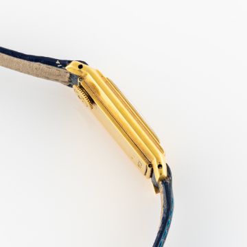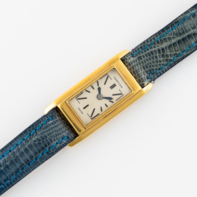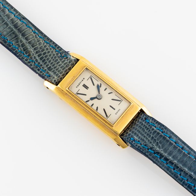 A LADY'S RARE 18K SOLID GOLD CARTIER NEW YORK RECTANGULAR BACK WIND "DUOPLAN" WRIST WATCHCIRCA 1946Movement: 15J, manual wind, cal. 409, signed European Watch and Clock Co Inc, numbered.Case: Measures approx. 34mm (including the lugs) by 15.6mm, marked EJ, 18k French hallmark, two sets of numbers. Strap: Leather. CONDITION REPORTDial: Original dial in good condition, showing some signs of ageMovement: Running & functioning at present, timekeeping and accuracy cannot be guaranteed.Case: In good condition, with some scratches wear due to general use.Strap/Bracelet: In fair condition.