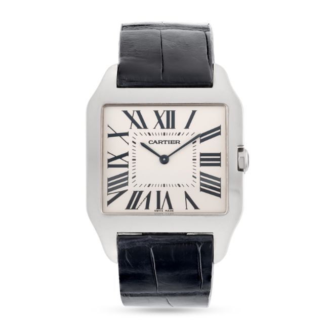 A GENTLEMAN'S SIZE 18K WHITE GOLD CARTIER SANTOS DUMONT WRIST WATCHCIRCA 2000s, REF. 2651Movement: Manual wind, signed Cartier.Case: Width approx. 35mm, signed Cartier, numbered, 18k hallmarks, sapphire crown. Strap: Leather strap with original 18k white gold Cartier deployant clasp. CONDITION REPORTDial: Original dial in excellent condition.Movement: Running & functioning at present, timekeeping and accuracy cannot be guaranteed.Case: In good condition, with light scratches due to general use.Strap/Bracelet: In excellent condition.