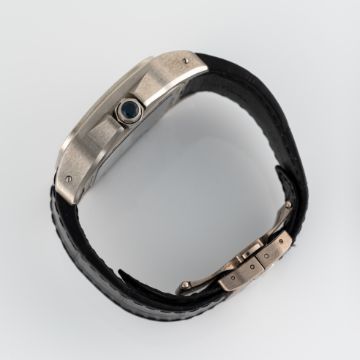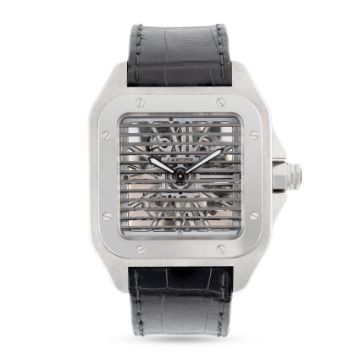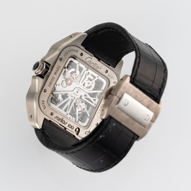 A RARE GENTLEMAN'S SIZE PALLADIUM CARTIER SANTOS TRIPLE 100 "SHUTTER" SKELETON WRIST WATCHCIRCA 2008, REF. 3228 THE "DOUBLE 100" LIMITED EDITION OF 100 PIECES Movement: 20J, manual wind, cal. 9611 MC, signed Cartier, numbered.Case: Width approx. 43mm, exhibition case back, signed Cartier Santos 100, Pd 950 Palladium, limited edition number, original sapphire crown.Strap: Cartier leather strap & 18k solid white gold deployment clasp. CONDITION REPORTDial: Original dials in excellent condition.Movement: Running & functioning at present, timekeeping and accuracy cannot be guaranteed.Case: In very good condition, with some light scratches due to general use.Strap/Bracelet: In excellent condition, deployment clasp in excellent condition.