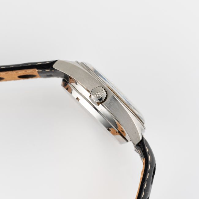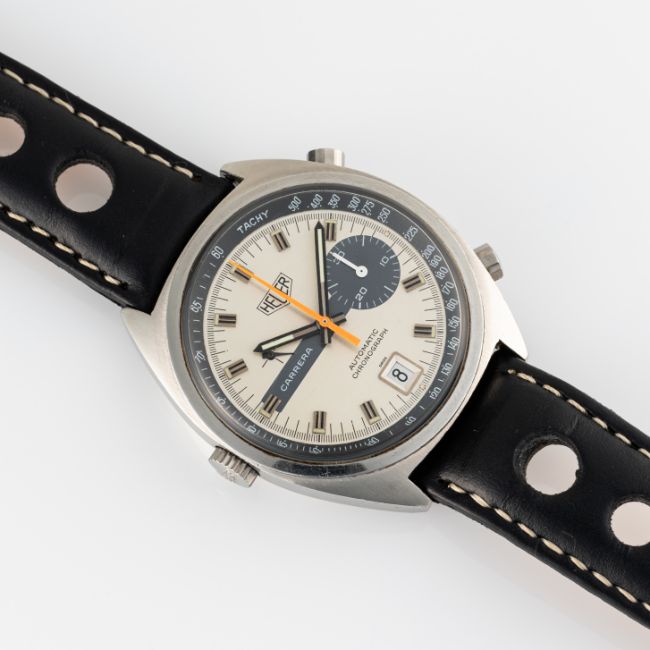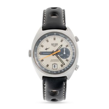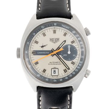 A GENTLEMAN'S SIZE STAINLESS STEEL HEUER CARRERA AUTOMATIC CHRONOGRAPH WRIST WATCH CIRCA 1972, REF. 1153 SMovement: 17J, automatic, cal. 15, signed Heuer.Case: Width approx. 38mm, screw back, signed Heuer-Leonidas SA, numbered 22x,xxx, Heuer crown & pushers.Strap: Leather. CONDITION REPORTDial: Original dial in excellent condition.Movement: Running & functioning at present, timekeeping and accuracy cannot be guaranteed.Case: In good condition, with some scratches due to general use.Strap/Bracelet: In good condition.