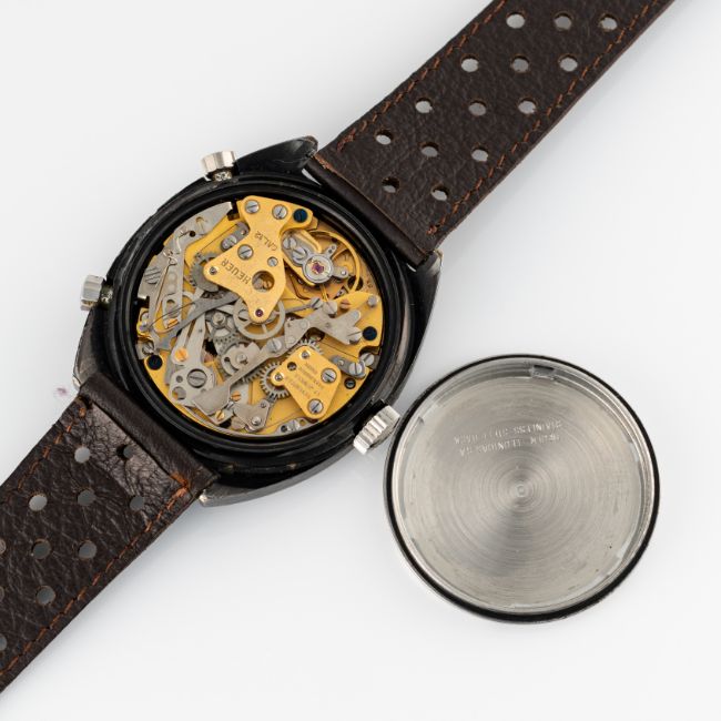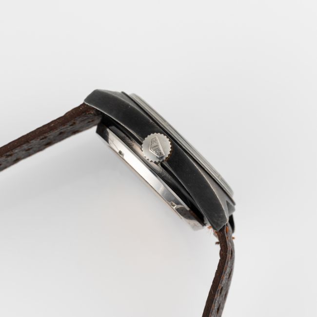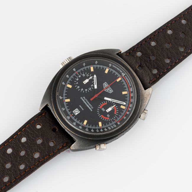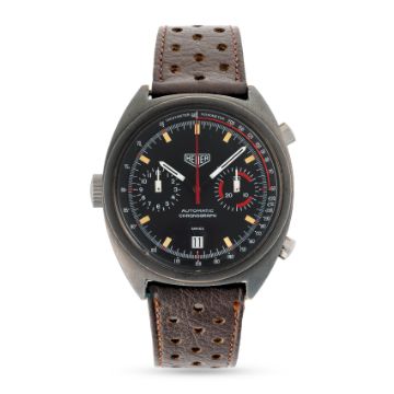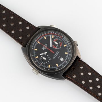 A GENTLEMAN'S SIZE PVD COATED HEUER MONZA AUTOMATIC CHRONOGRAPH WRIST WATCH CIRCA 1981, REF. 110.501 Movement: 17J, automatic, cal. 12, signed Heuer.Case: Width approx. 39mm, steel screw back, signed Heuer-Leonidas SA, signed Heuer Monza on case back, numbered 39x,xxx, Heuer crown & pushers.Strap: Perforated leather. CONDITION REPORTDial: Original dial in very good condition.Movement: Running & functioning at present, timekeeping and accuracy cannot be guaranteed.Case: In good condition, with some wear due to general use.Strap/Bracelet: In very good condition.