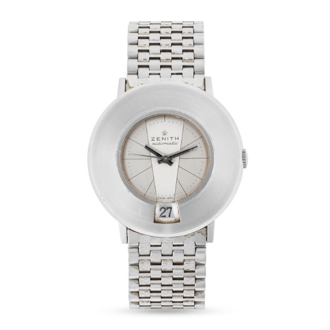 A GENTLEMAN'S SIZE STAINLESS STEEL ZENITH "KEY HOLE" AUTOMATIC BRACELET WATCH CIRCA 1960s, REF. A6621 WITH TWO TONE SILVER DIALMovement: Automatic, cal. 215, signed Zenith.Case: Diameter approx. 35.5mm, two piece case, signed Zenith, numbered, Zenith crown.Bracelet: Stainless steel Zenith NSA bracelet. CONDITION REPORTDial: Original dial in excellent condition.Movement: Running & functioning at present, timekeeping and accuracy cannot be guaranteed.Case: In very good condition, with some scratches due to general use.Strap/Bracelet: In very good condition.