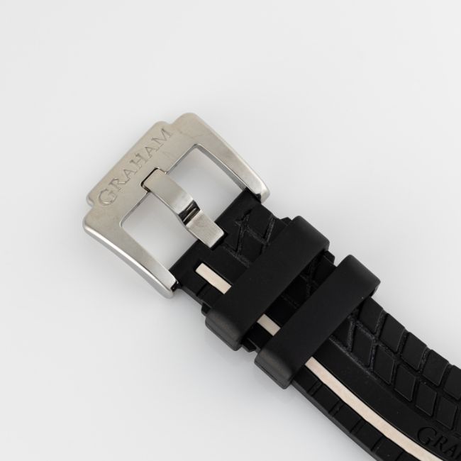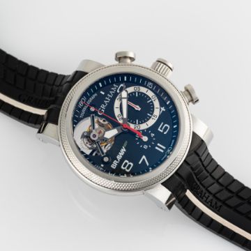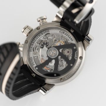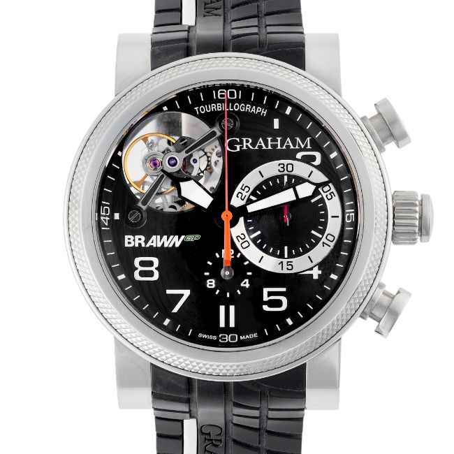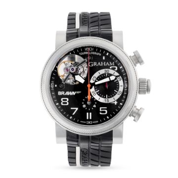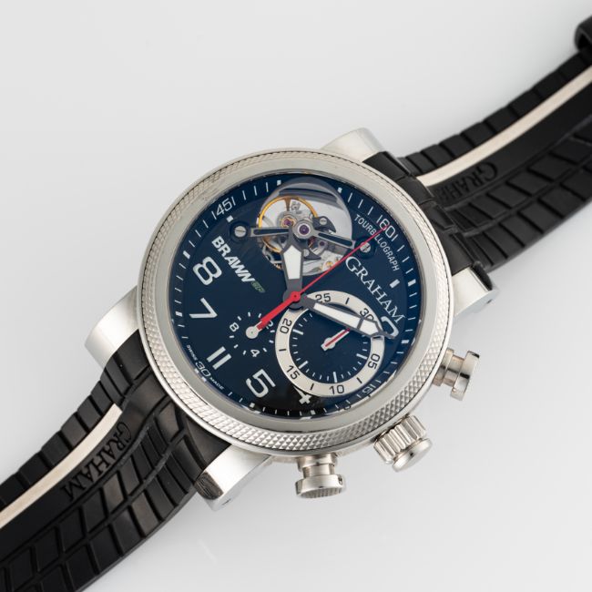 A GENTLEMAN'S SIZE STAINLESS STEEL GRAHAM TRACKMASTER TOURBILLOGRAPH TOURBILLION CHRONOGRAPH WRIST WATCHCIRCA 2021, REF. 2BRTS.B03A.K68W BRAWN GP LIMITED EDITION OF 100 PIECESMovement: 34J, automatic, signed Graham.Case: Diameter approx. 47mm, exhibition case back, signed Trackmaster, Limited Edition number, original crown.Strap: Original Graham rubber strap & stainless steel pin buckle. CONDITION REPORTDial: Original dial in excellent condition.Movement: Running & functioning at present, timekeeping and accuracy cannot be guaranteed.Case: In very good condition, with some light scratches due to general use.Strap/Bracelet: In excellent condition.
