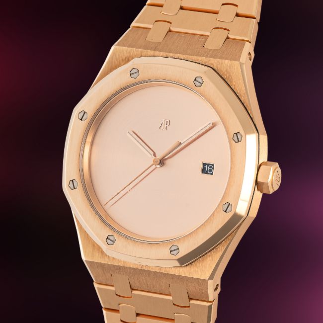 A VERY RARE GENTLEMAN'S SIZE 18K ROSE GOLD AUDEMARS PIGUET ROYAL OAK JUMBO BRACELET WATCHDATED 2021, REF. 15400OR CUSTOMISED BY MAD PARIS IN COLLABORATION WITH 1017 ALYX 9SM & MATTHEW WILLIAMS, LIMITED EDITION OF ONLY 10 PIECES, ACCOMPANIED BY ITS ORIGINAL MAD PARIS BOX & GUARANTEE CARDMovement: 40J, automatic with gold rotor, cal. 3120, signed Audemars Piguet, numbered.Case: Diameter approx. 41mm, exhibition case back, signed Royal Oak, numbered, AP crown.Bracelet: Original AP Royal Oak rose gold bracelet with 1017 ALYX 9SM custom clasp. CONDITION REPORTDial: Original dial in excellent condition.Movement: Running & functioning at present, timekeeping and accuracy cannot be guaranteed.Case: In excellent condition, with some light scratches due to occasional use.Strap/Bracelet: In excellent condition, with light scratches.