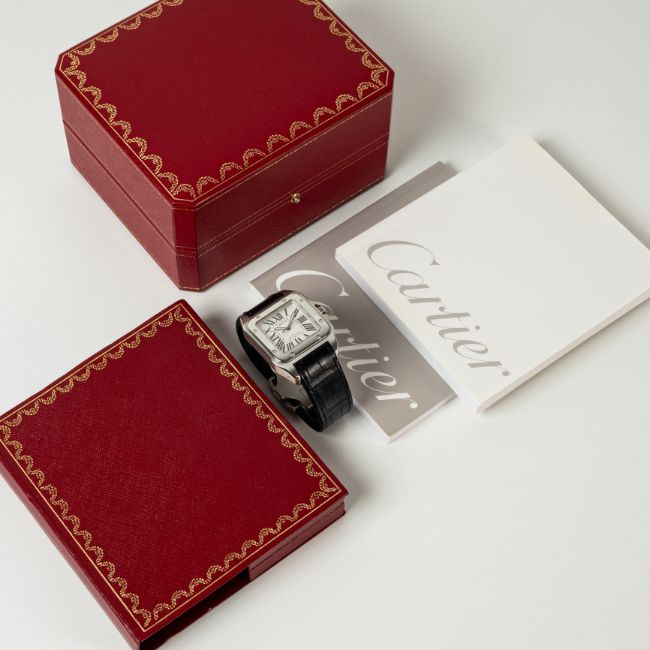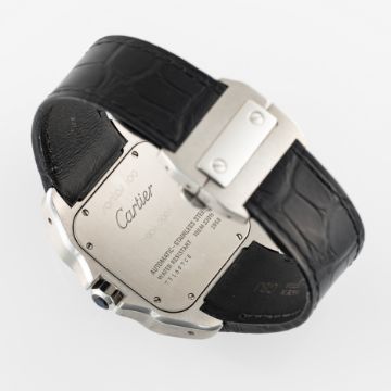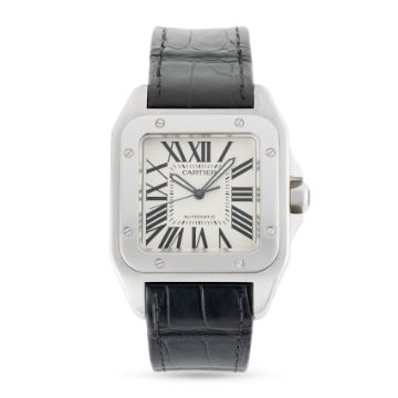 A GENTLEMAN'S SIZE STAINLESS STEEL CARTIER SANTOS 100 AUTOMATIC WRIST WATCHDATED 2004, REF. 2656 XL CELEBRATING 100 YEARS OF CARTIER SANTOS, ACCOMPANIED BY ITS ORIGINAL CARTIER BOX, GUARANTEE BOOKLET & SERVICE PAPERWORK FROM 2020Movement: Automatic, signed Cartier.Case: Width approx. 38mm, signed Cartier Santos 100 1904-2004, numbered, sapphire crown. Strap: Cartier leather strap & Santos deployant clasp.  CONDITION REPORTDial: Original dial in excellent condition. Movement: Running & functioning at present, timekeeping and accuracy cannot be guaranteed. Case: In excellent condition. Strap/Bracelet: In excellent condition, clasp has light scratches.